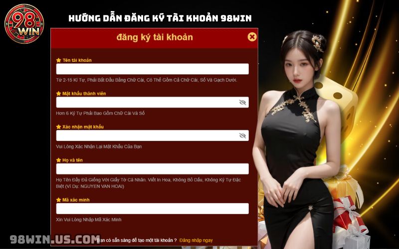Đây là bước quan trọng nhất trong hướng dẫn đăng ký tài khoản 98Win. Form đăng ký yêu cầu các thông tin sau: